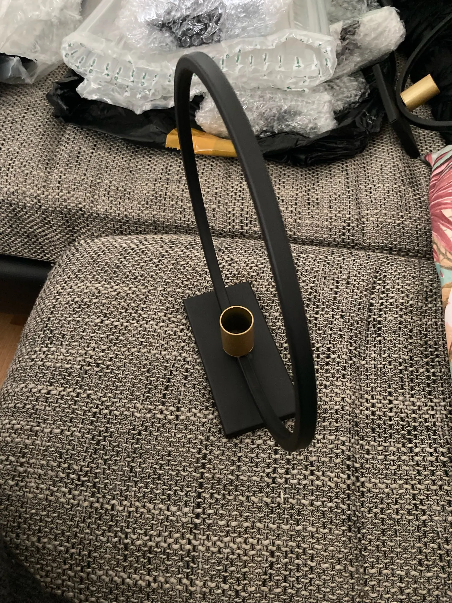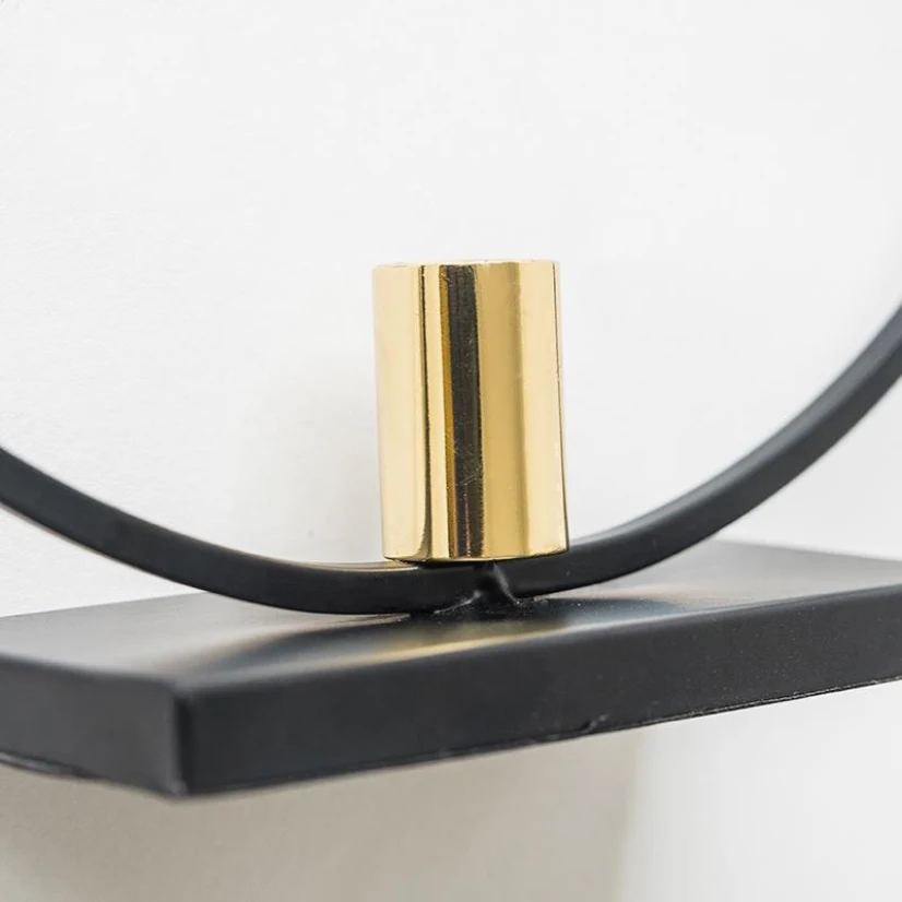 Супер красивый подсвечник металлический. Черный круг с золотым держателем посередине. Супер стабильный пол. В нижней части есть для удержания еще анти коврик скольжения/пена или так в нем. Вы упаковка товаров супер хорошо защищенная! Верх!