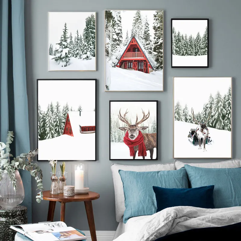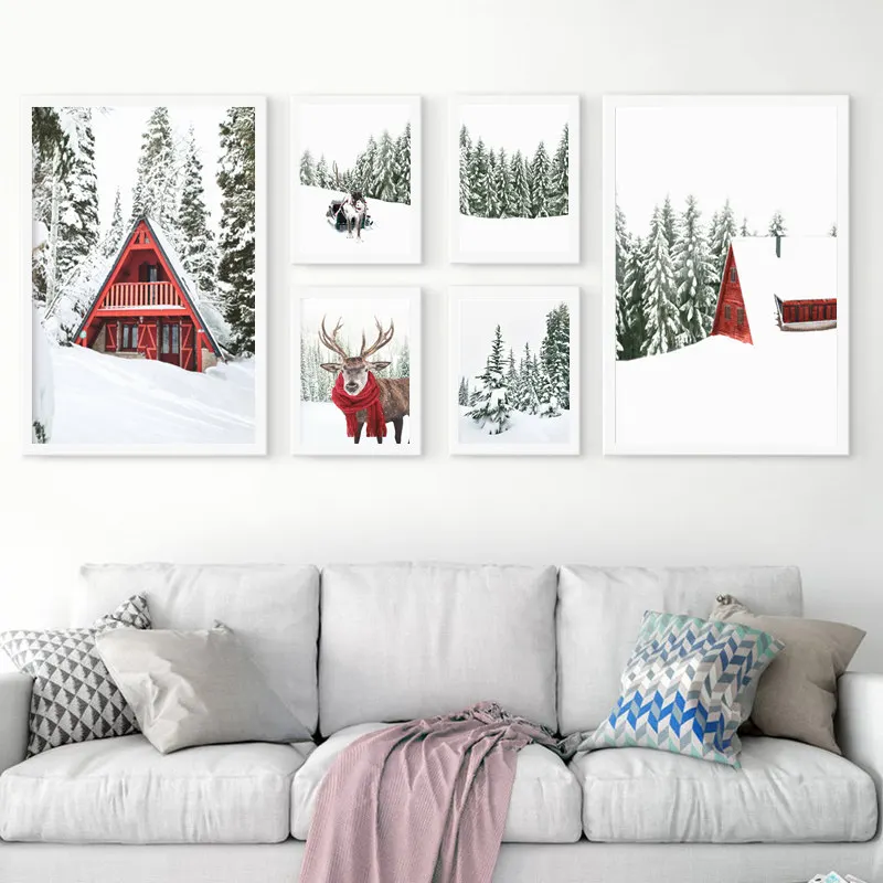 Рождественский снег лес настенные картины красный дом стены искусст...