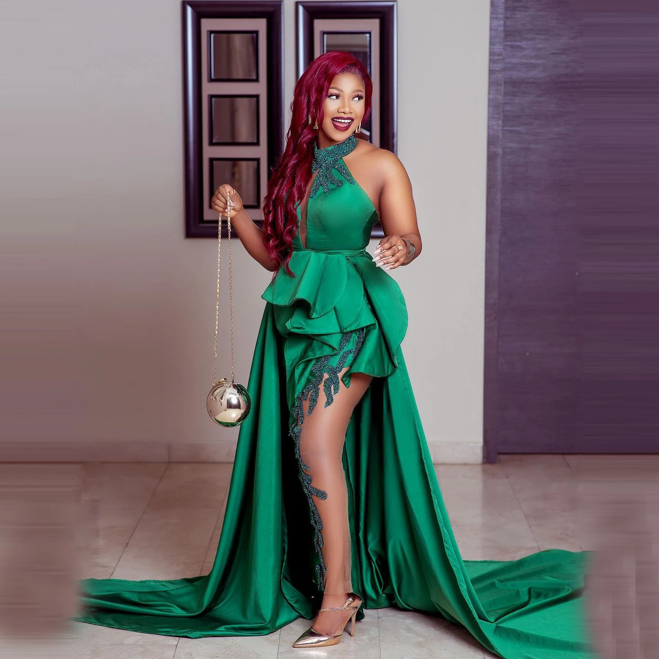 Женское вечернее платье-русалка, зеленое платье без рукавов, с лямкой на шее и длинным шлейфом, расшитое бисером, для выпускного вечера, 2021