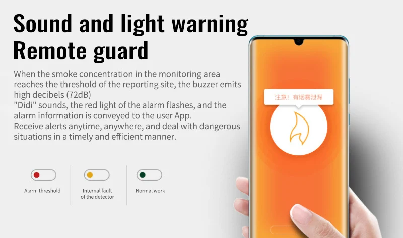 【Звуковой сигнал и светильник]】При обнаружении того, что концентрация дыма в воздухе достигает стандарта, детектор издаст сигнал до 72 децибел и издаст красный светильник, мигающий сигнал тревоги, И отправьте сигнал тревоги на хост, и сообщите информацию на мобильный телефон пользователя.