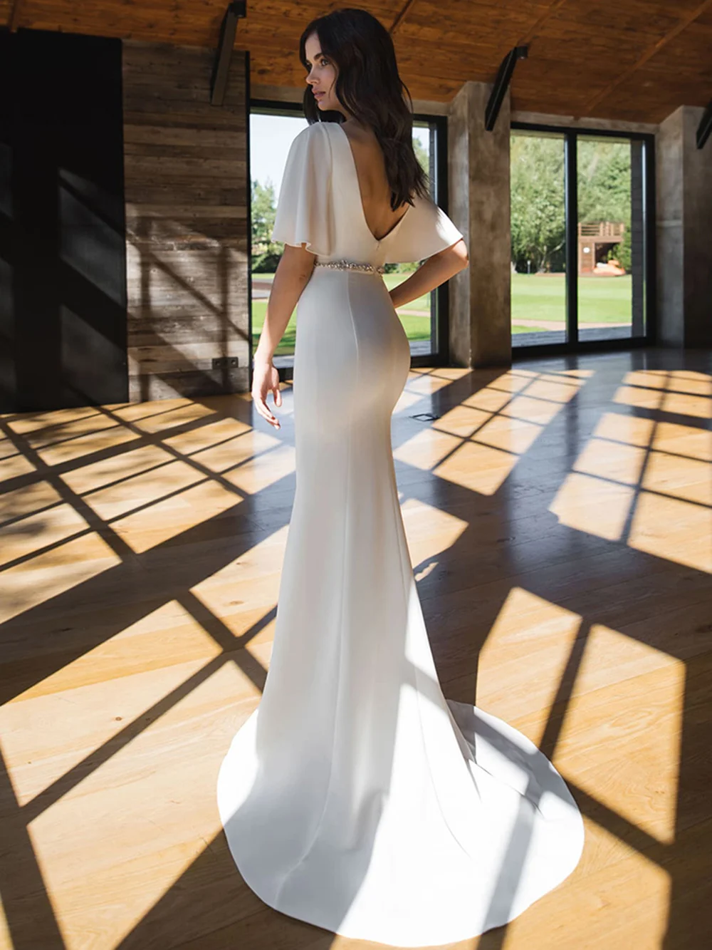 Простое свадебное платье А-силуэта с круглым вырезом и рукавами-кры...