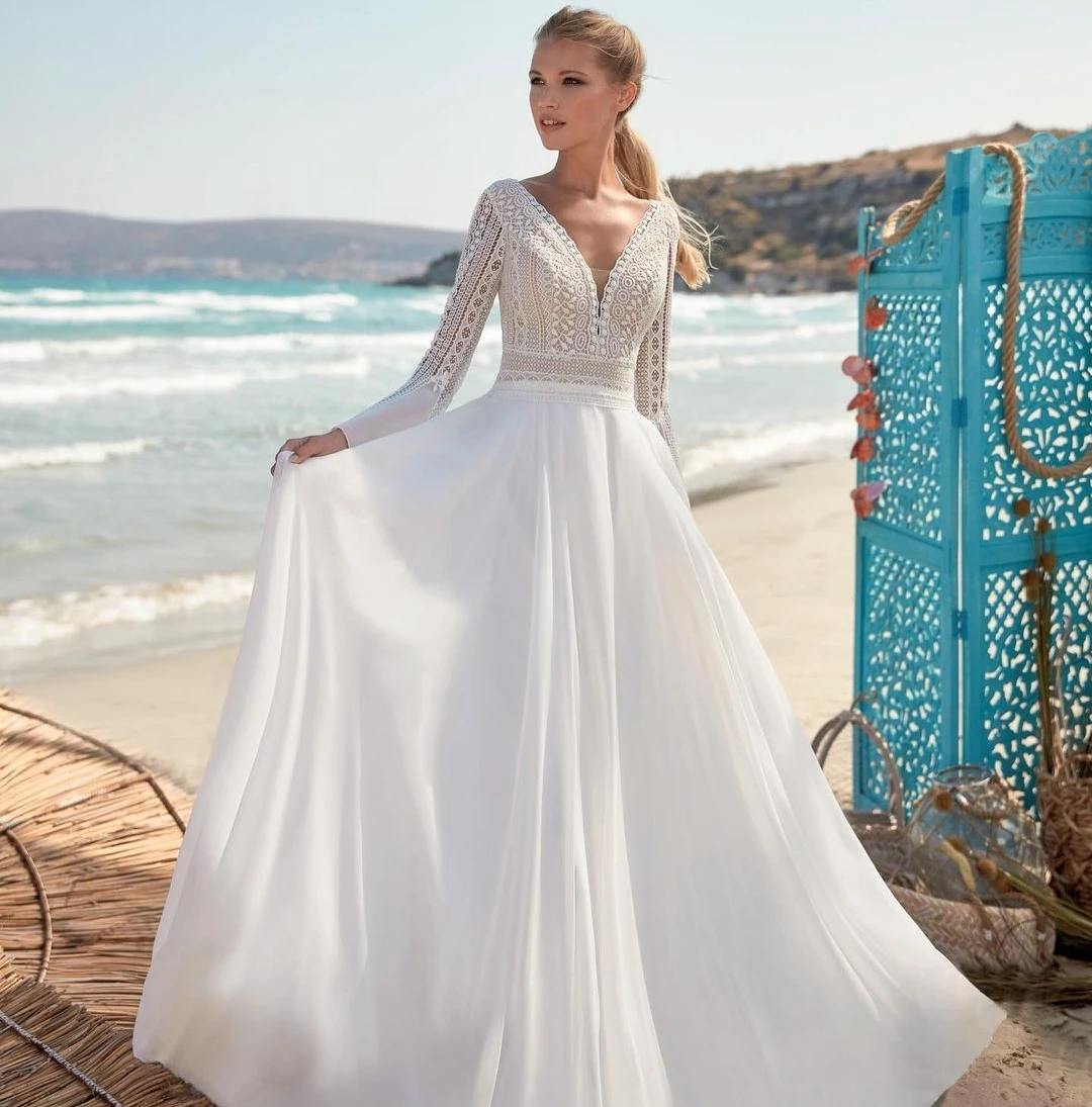 Элегантное сексуальное свадебное платье в стиле бохо с длинными рук...