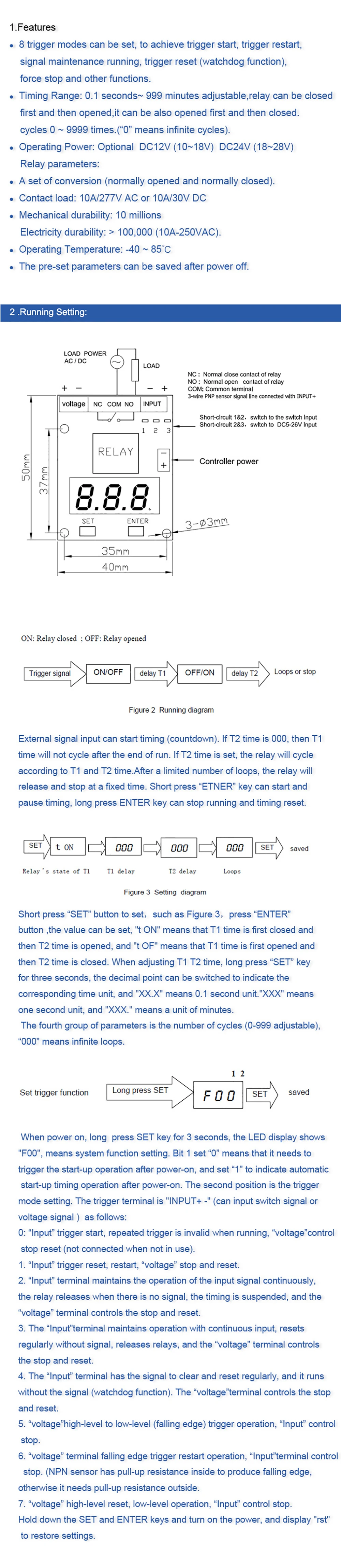 Особенности: Можно установить 8 режимов триггера для запуска триггера, перезапуска, обслуживания сигнала, сброса запуска (функция наблюдения), остановки силы и других функций. Диапазон времени: от 0,1 до 999 минут (три диапазона регулировки 0,1 до сек., 1 ~ 999 сек., и 1 ~ 999 мин.) Реле можно сначала закрыть, а затем открыть, а затем сначала открыть, а затем закрыть. Циклы 0 ~ 9999 раз. («0» означает бесконечные циклы). Предварительно установленные параметры можно сохранить после выключения питания. Набор конверсий (обычно открывается и нормально закрывается). Характеристики: Тип: DC12V/ DC24V (опционально) Материал: PCB Рабочая мощность: 12 В постоянного тока (10 ~ 18 в) или 24 В постоянного тока (18 ~ 28 В) Контактная нагрузка: 10 А/277 В переменного тока или 10 а/30 В постоянного тока Контактное сопротивление: ≤ 100 МОм (1 а 6 В постоянного тока) Прочность электричества:> 100000 (10A-250VAC) Механическая прочность: 10 миллионов Рабочая температура: -40 ~ 85 ℃ Размер изделия: 50*40*20 мм/1,97*1,57 * дюйма Вес изделия: 27 г/0,95 унции Вес посылка: 30 г/1,06 унции Посылка: 5*4*2 см/1,97*1,57 * дюйма Упаковочный лист: 1 * Модуль