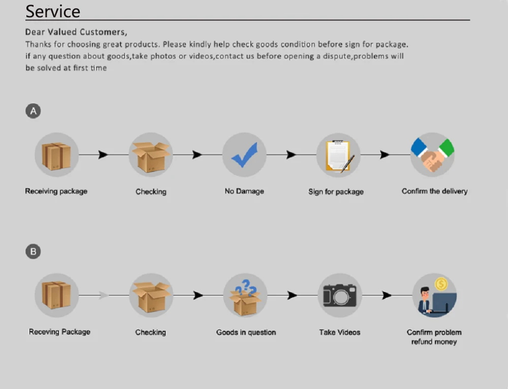 2. Если у вас возникли проблемы с качеством при получении товара, пожалуйста, свяжитесь с нашей службой поддержки клиентов, мы решим вашу проблему или вернем вам деньги.