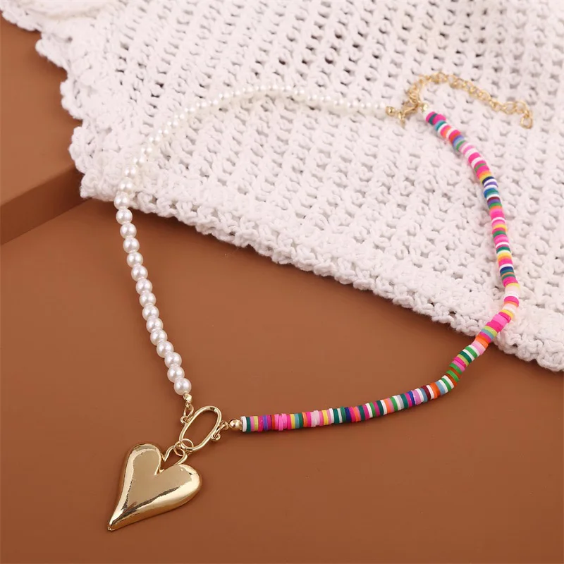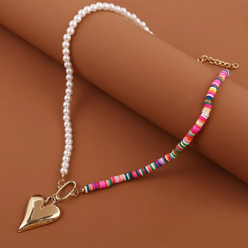Богемное многоцветное ожерелье из полимерной глины, белый жемчуг с бисером, асимметричное ожерелье для женщин, модное ожерелье золотистого цвета с подвесками в виде большого сердца