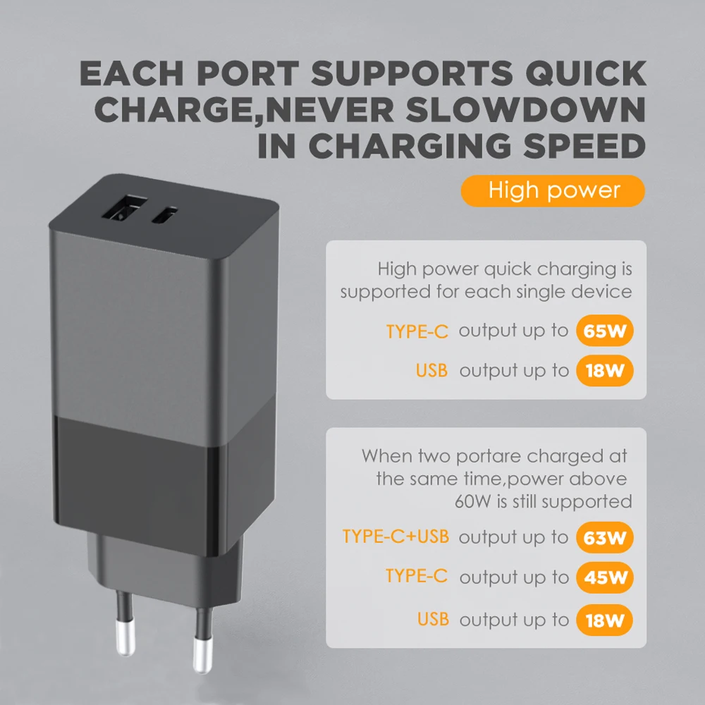 Зарядное устройство GaN на 2 порта USB, 452018 Вт, 65 Вт