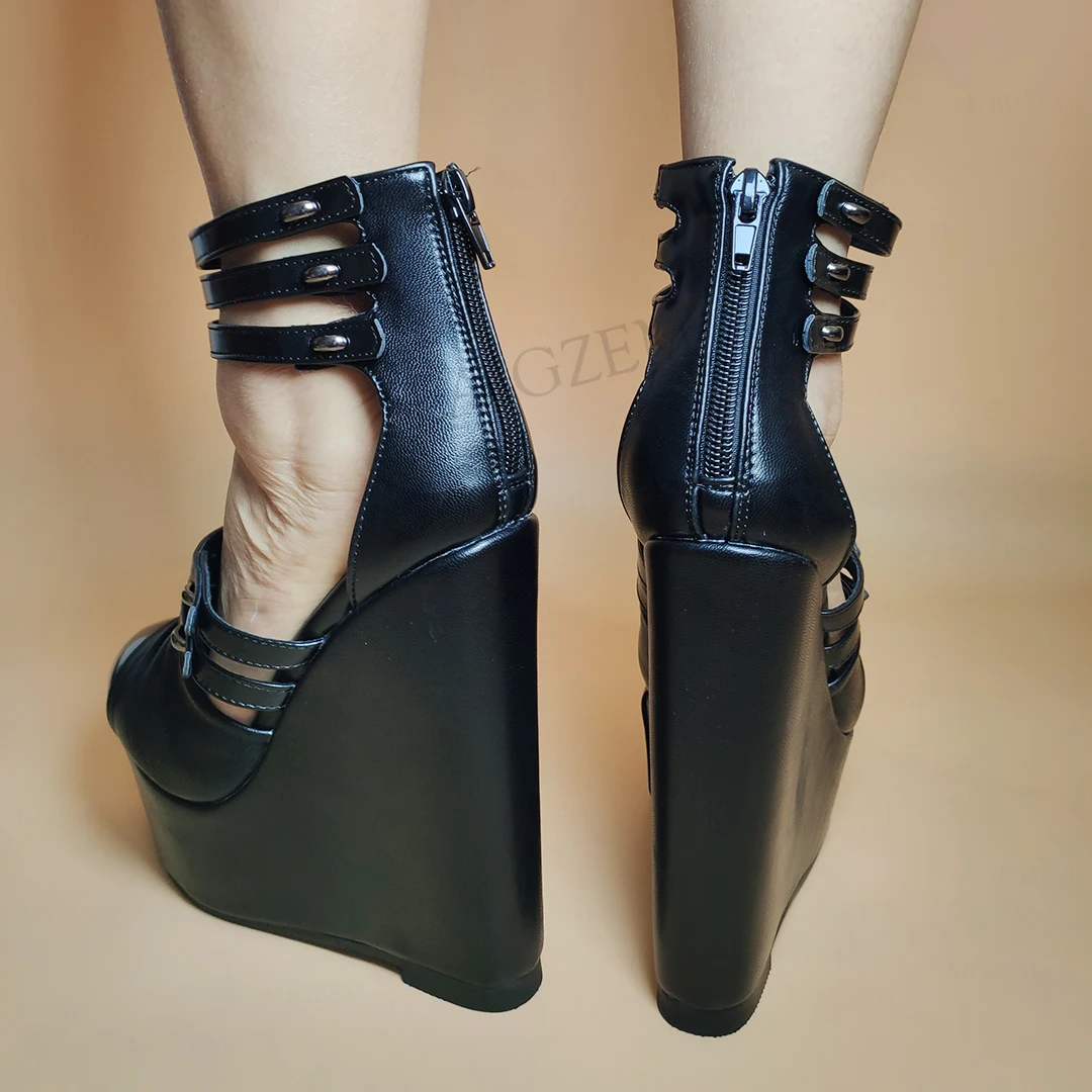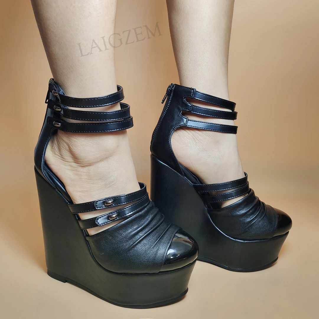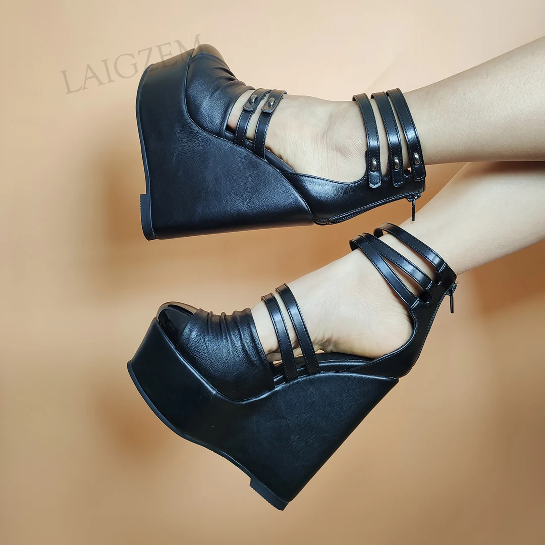 LAIGZEM/очень женские босоножки черные туфли-лодочки из искусственной кожи на платформе с молнией женская обувь; Zapatos de Mujer; Большие размеры 42, 48, 50, 52