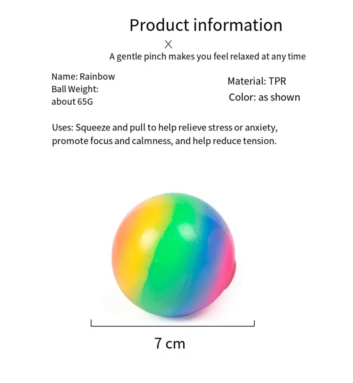 Название продукта: Радужный шарМатериал: ТПРВес: 100 гЦвета: несколько цветовРазмер: 7 см или 8,5 см в диаметреОсобенности продукта: небольшой вкус, экологическая безопасность, мягкость и удобствоИспользование: сжимайте и потяните, чтобы снять стресс или тревогу, повысить фокус и спокойствие, а также уменьшить напряжение.