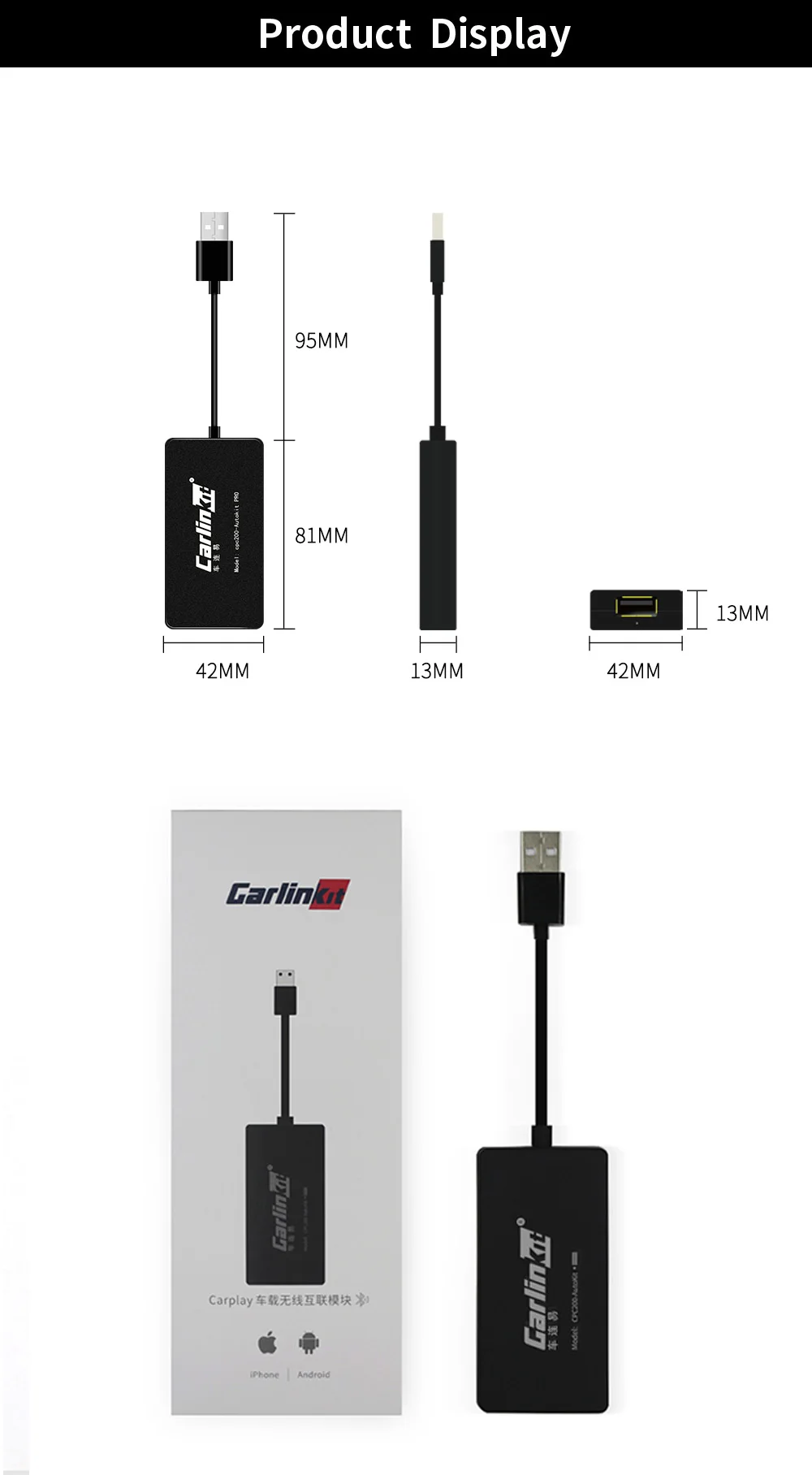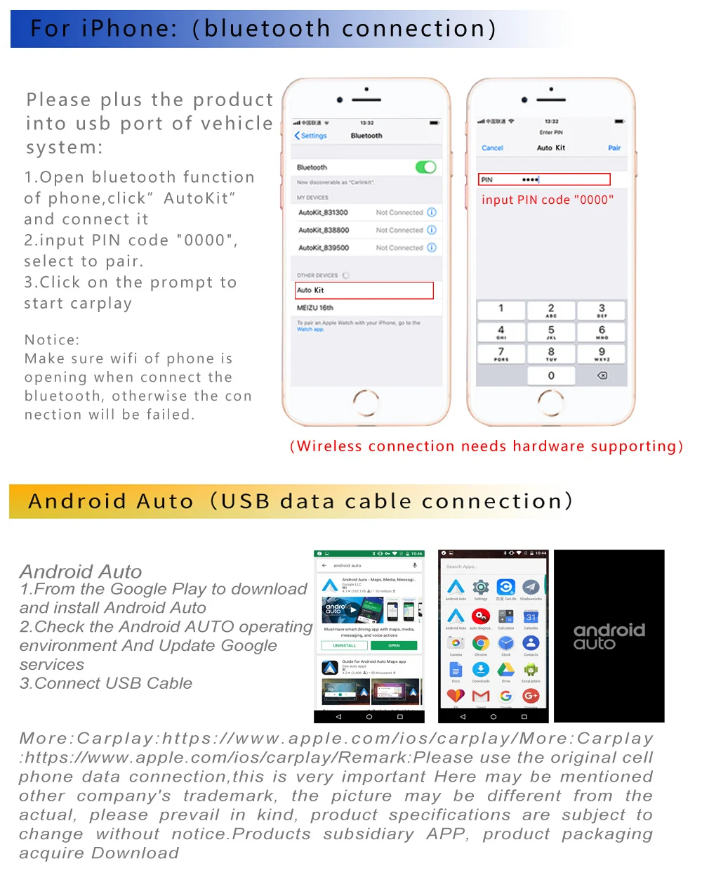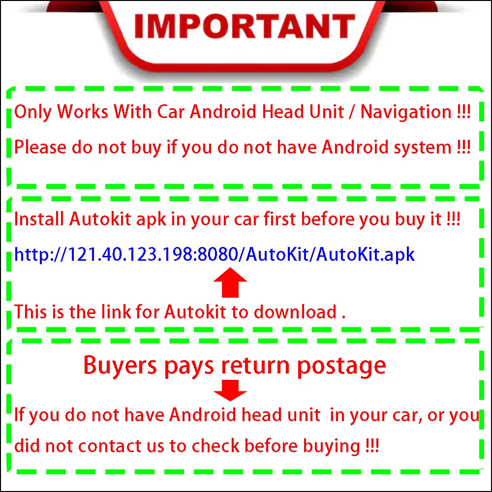 -Этот продукт не совместим с оригинальным заводским автомобильным экраном.-Этот продукт поддерживает 99% послепродажное головное устройство Android и 99% iPhone/Android телефон. -Этот продукт не работает на машине WinCE.-Беспроводное соединение поддерживает только телефоны Apple с IOS10 и выше-Телефоны Android могут быть подключены только через USB кабель-Android Auto поддерживает Android 4,2 и выше