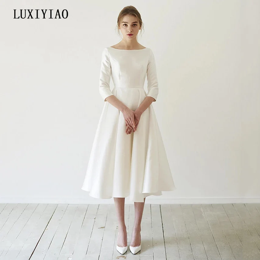 Новое простое свадебное платье, атласное платье длиной до колена с рукавом, свадебное платье для свадьбы, свадебное платье, Прямая поставка из Китая
