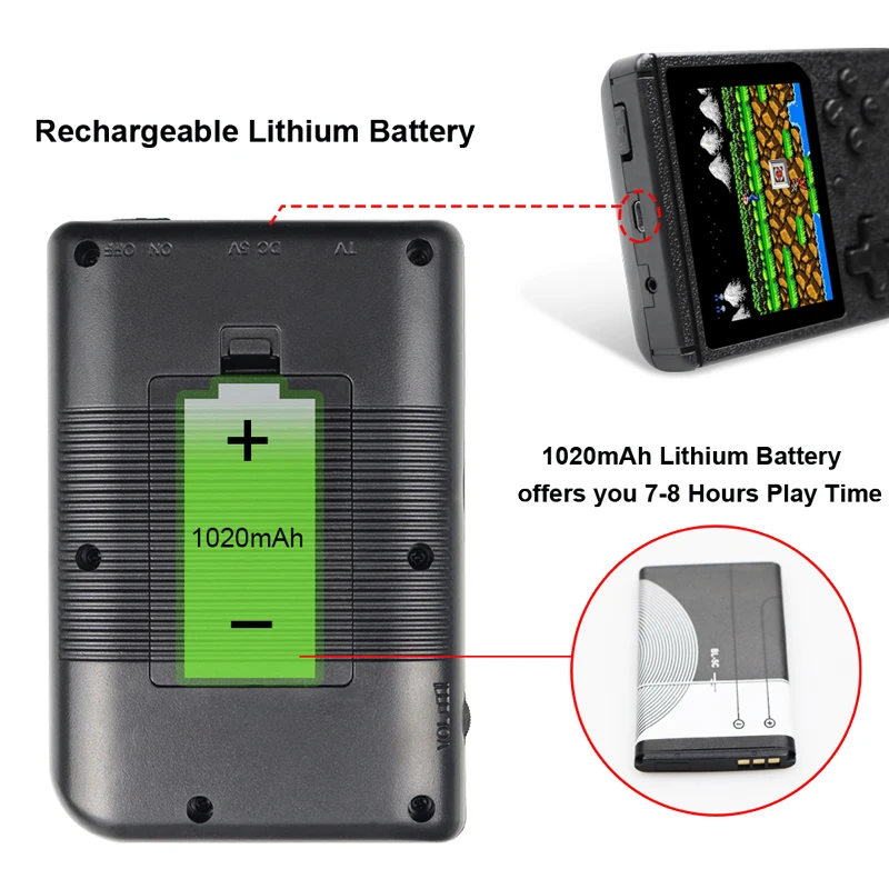 Эта портативная консоль поставляется с перезаряжаемой литиевой батареей емкостью 1020 мАч, более 7 часов автономной работы. Когда вы в командировке, путешествиях, кемпинге, вам не нужно беспокоиться о разрядке питания.