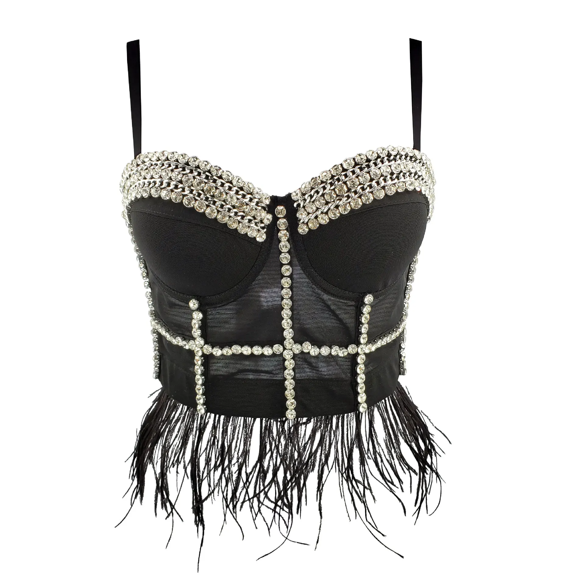Женские Привлекательные дизайнерские сетчатые топы с кристаллами и бриллиантами, хлопковые топы с черными и белыми перьями, женские модные укороченные топы, лето 2021