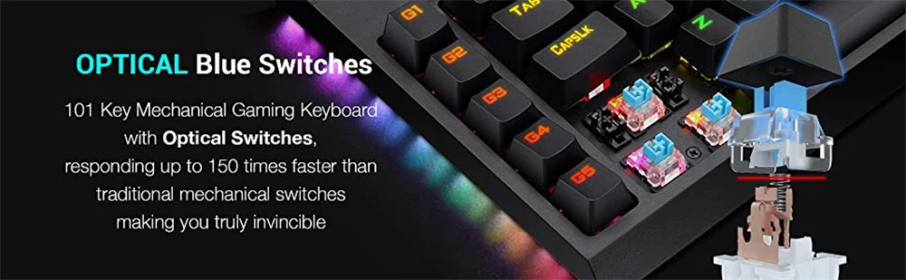 Ультра-быстрые оптические синие переключатели-Наслаждайтесь самым точным набором текста с оптико-механическими синими переключателями Redragon, которое практически мгновенное включение. Время отклика 0,2 мс время отклика 10x быстрее, чем стандартные механические переключатели. Пыленепроницаемые оптико-механические коробчатые Переключатели имеют меньшую механическую сложность, что делает их неабразивными, пыленепроницаемыми и пыленепроницаемыми.