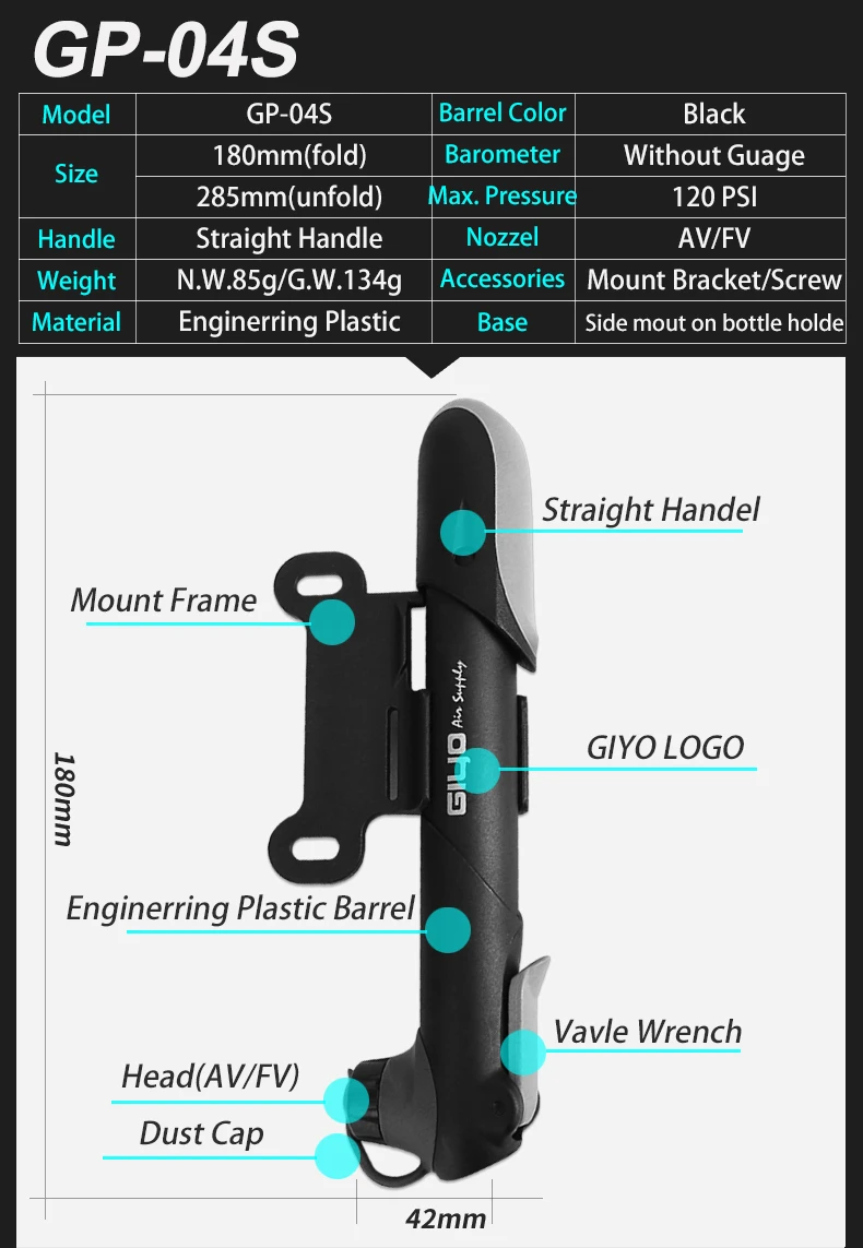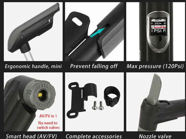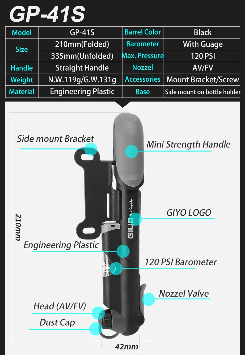 * Этот насос имеет высокое давление 120PSI с точным линейным манометром. Легко крепится на раму велосипеда.