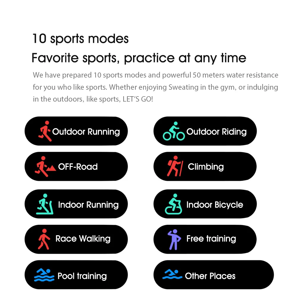 Легко начать занятия спортом, оснащенный водонепроницаемым дизайном 5 АТМ, вы можете наслаждаться бегом на открытом воздухе, верховой ездой на открытом воздухе, бегом по пересеченной местности, альпинизмом, бегом в помещении, велоспортом в помещении, ходьбой, бесплатное обучение, плавательный бассейн, Открытый плавательный бассейн