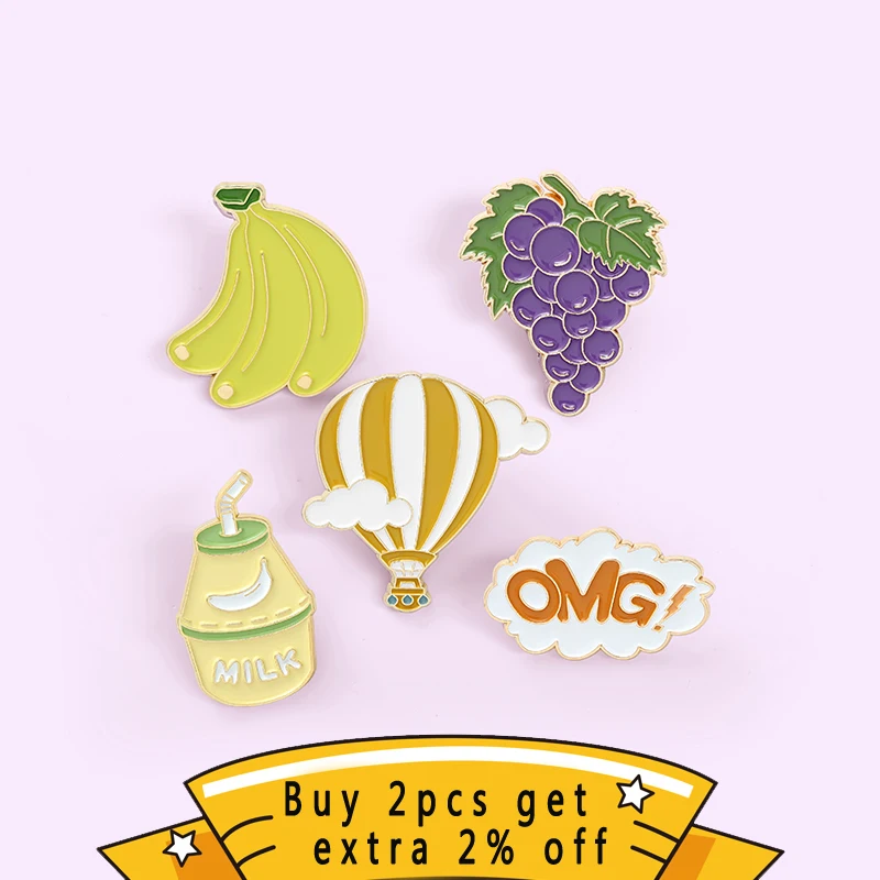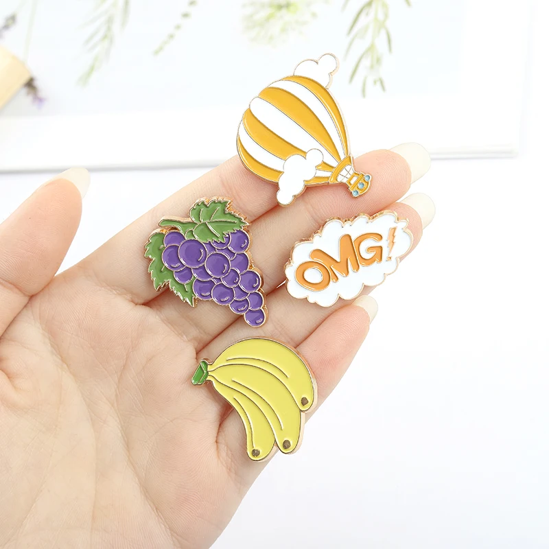 Мультяшные эмалевые булавки, булавки для лацканов с изображением горячего воздушного шара, винограда, банана, молока, Омбре, фрукты, милые аксессуары для шляпы