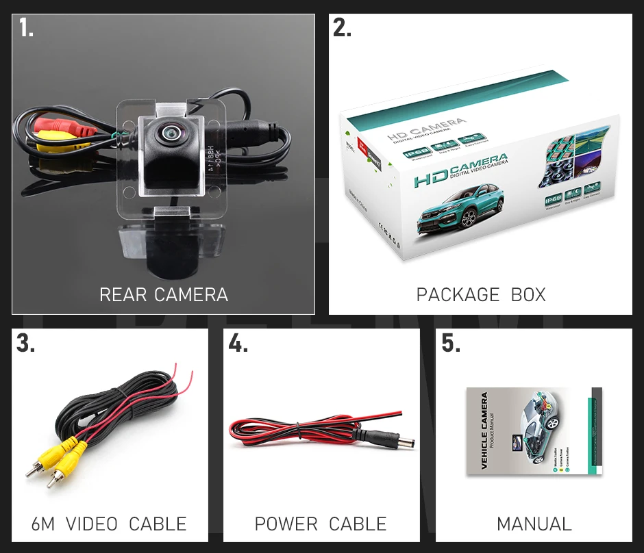 1. Задняя камера2. Коробка для посылка3. Видео кабель (6 м)4. Кабель питания5. Руководство пользователя