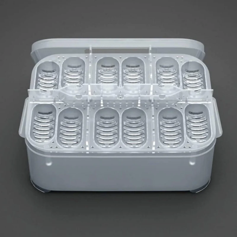 Поднос основан на методе взвешенной инкубации, где спышки не прикасайтесь к подложке, но подвешиваются над ней с лотком. Это обеспечивает большую циркуляцию воздуха и улучшает скорость вылупления.