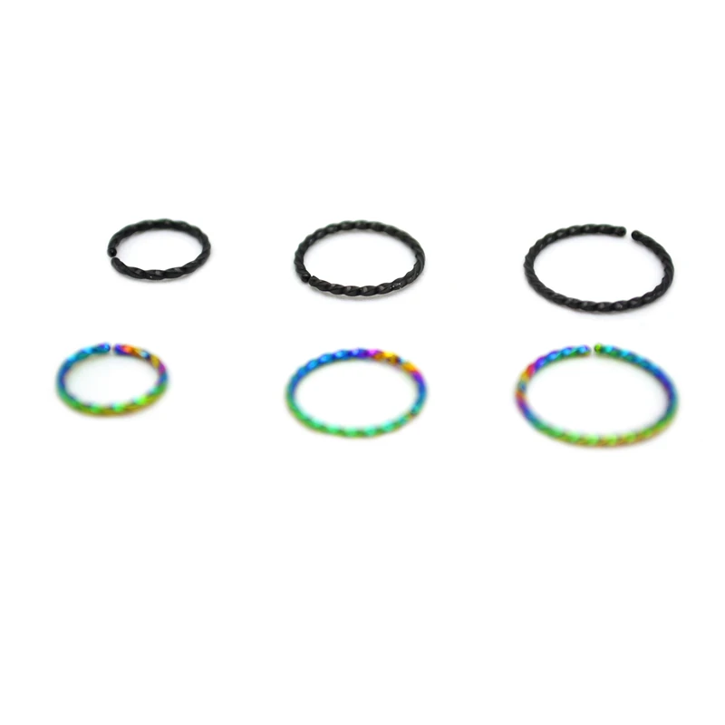 Стиль: витое кольцо серьга из носового кольца Цвет: сталь, Черное золото, розовое золото, Raiinbow Размер: 0,8x6 мм, x 8 мм, x 10 мм Материал: нержавеющая сталь 316L Кол-во: 100 шт./лот
