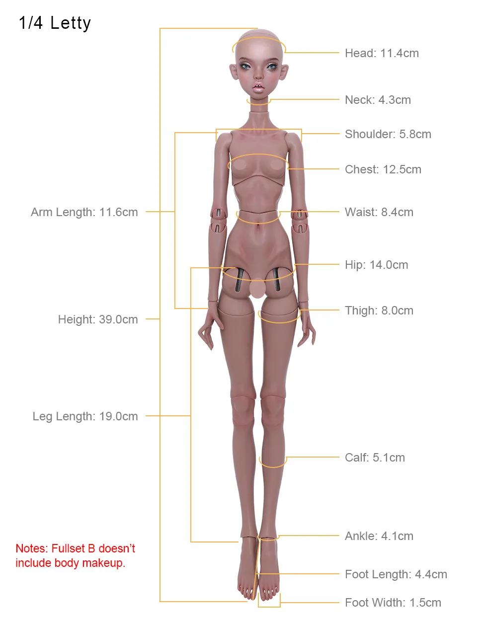 Высота: 39,0 смОкружность головы: 11,4 смОкружность шеи: 4,3 смШирина плеч: 5,8 смОбхват груди: 12,5 смОкружность талии: 8,4 смОбхват бедер: 14,0 смДлина руки: 11,6 смДлина штанины: 19,0 смОкружность бедра: 8,0 смОкружность икры: 5,1 смОкружность лодыжки: 4,1 смШирина стопы: 1,5 смДлина стопы: 4,4 смГлаза: 6 ммPS: из-за измерения вручную возможна погрешность в 1-3 см, надеемся на понимание!