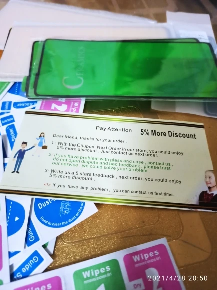 Коробка пришла немного помятая, но на стекле это не отразилось. Упаковано хорошо, все целое. Пока не клеила, но приложила к телефону, всё совпадает. Спасибо продавцу за заботу. Да, ещё вложили купон на 5% скидку.