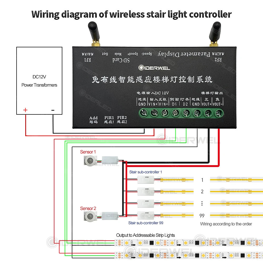 Примечание: В комплект не входит шнур питания. Нужно подготовить 0,75-2 проволока прямоугольного сечения для подключения к каждому суб-контроллер.