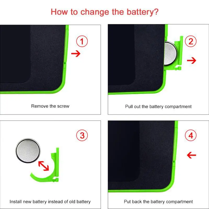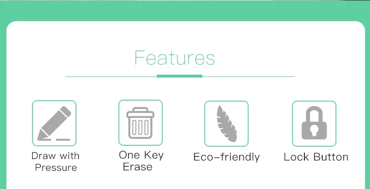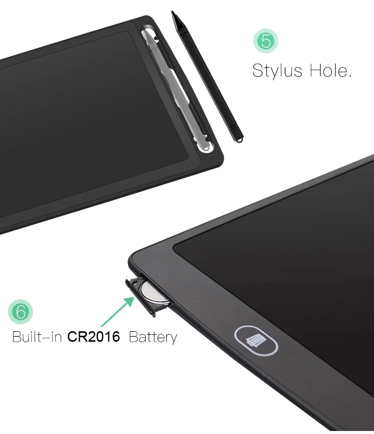Чувствительная к давлению поверхность ЖК-дисплея делает ваше письмо или рисунок появляются без каких-либо задержек.Пишите или рисуйте с помощью прилагаемого пластикового стилуса или любого другого подходящего инструмента, даже пальцем!Простота в эксплуатации и высокая эффективность, Стирайте рисунок одним нажатием кнопки стирания.Ультратонкий и компактный дизайн, легко носить с собой и легко скользить в ваш портфель, рюкзак или другую сумку.Легкий и портативный, идеально подходит для школы, офиса, домашнего использования или другого использования.Встроенный сменный кнопочный элемент.