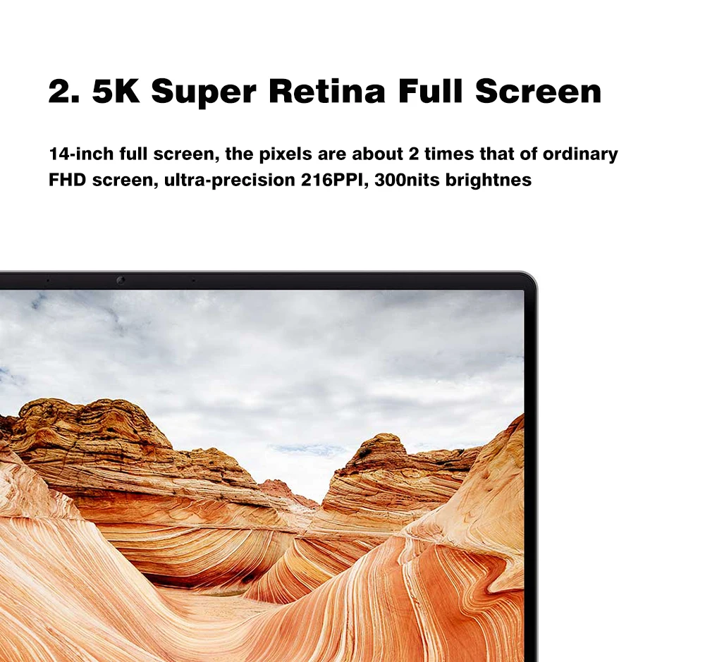Полноразмерный экран 14 "Super Retina *Разрешение 2560 × 1600Узкая рамка 4,3 мм *, соотношение экрана к корпусу 88.2% *,Соотношение сторон дисплея 16:10, антибликовый жесткий экран высокой четкости, широкий угол обзора 178 °,300 нит яркость (типовое значение), 1000:1 контрастность (типовое значение),Цветовая гамма 100% sRGB (типовое значение), поддержка регулирования постоянного тока,Сертификация TUV V Rheinland с низким сисветильник