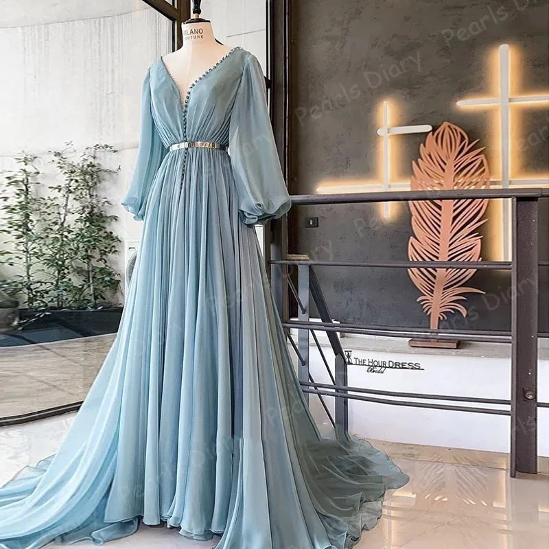 Элегантные арабские вечерние платья с длинным рукавом Дубай синие официальные платья для женщин с V-образным вырезом пуговицы свадебное платье большого размера