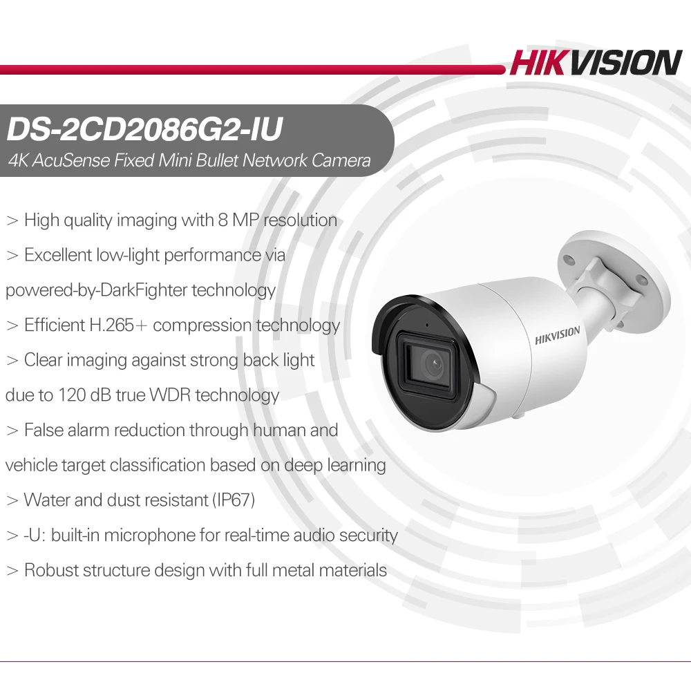 DS-2CD2086G2-IU4K 8MP AcuSense Fixed Mini Bullet Network Camera> High quality imaging with 8 MP resolution> Excellent low-light performance with powered-by-DarkFighter technology> Efficient H.265+ compression technology> Clear imaging against strong back light by 120 dB true WDR technology> False alarm reduction by human and vehicle target classification based on deep learning> -U: built-in microphone for real-time audio security> Water and dust resistant (IP67)> Connecter panel interface for easy installation> Robust structure design with full metal material