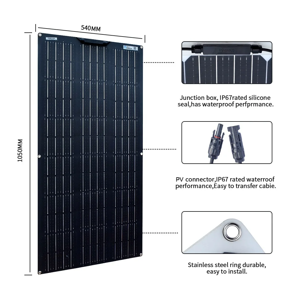 Гибкая солнечная панель XINPUGUANG мощностью 100 Вт изготовлена из монокристаллического элемента PERC с коэффициентом конверсии 22%. Вес составляет 1,85 кг (4 фунта), что составляет 20% от традиционных солнечных панелей. Размер составляет 1030X525X3 мм (40,55x20,66x0,11 дюйма).Легкий вес гибких панелей солнечных батарей делает солнечные панели более эффективными для использования в радиоуправляемых автомобилях, фургонах, лодках, палатках, прицепах, кабинах и т. д. портативными, простыми в установке, подключайте и играйте.