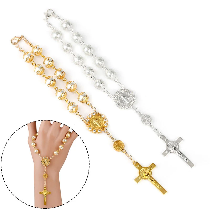 Браслет с искусственным жемчугом для женщин, с белым крестом Иисуса, ручной работы, золотой, серебряный цвет, браслет для крещения