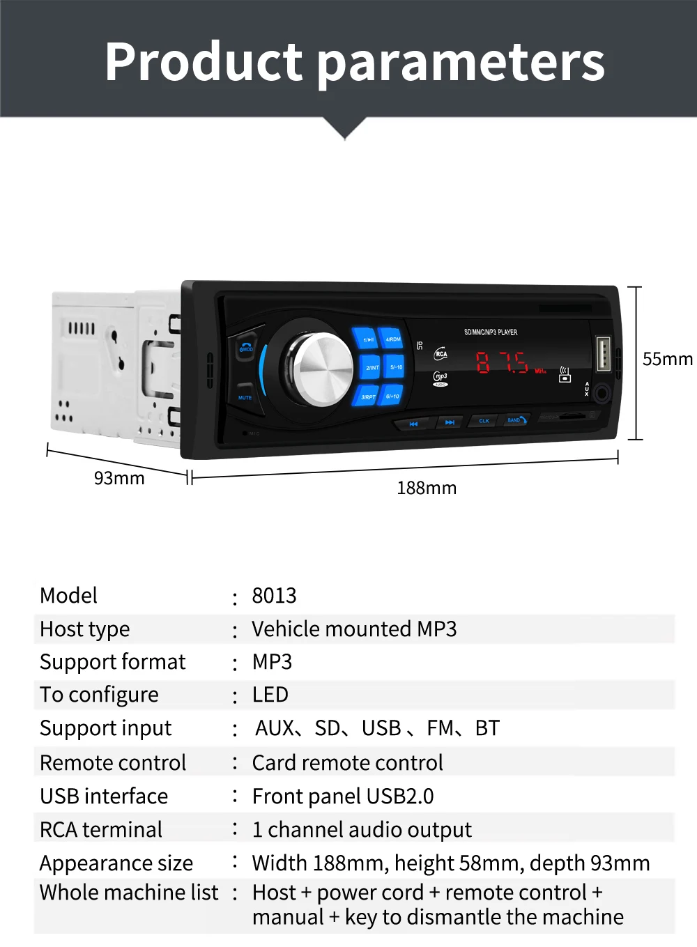 Режимы поддержки: BT / APE / WAV / WMA / MP3 / FM