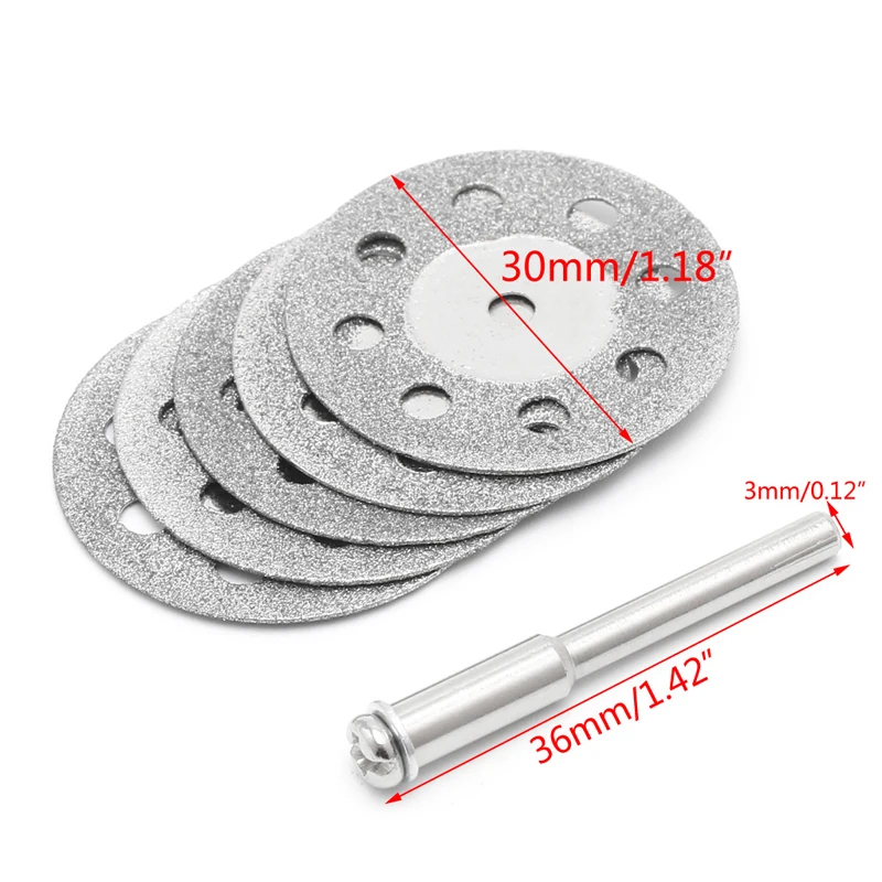Особенности товараOOTDTYРазмер: 30 ммТип: абразивный дискОн подходит для резки камней, нефрита, тонкого металла и стекла и имеет преимущества высокой эффективности резки, высокой долговечности и стабильного качества.Посылка включает в себя:5X 30 мм алмазные режущие диски1 оправка