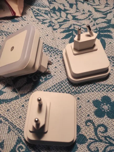 Куплено 3 шт за 97 руб шт. Доставка 0 руб за полтора месяца. Упаковано плохо. Когда открывал и вытаскивал их из пакетика, думал, что им кирдык, судя по состоянию упаковки ( см. фото). Повезло. только у одного погнут контакт, который суется в розетку, а у другого отпал глазок, который защищает фотоэлемент. Поправил пальцами контакт, всунул в розетку - работает, глазок закрепил на суперклей. Штука полезная, неприхотливая. Всунул в розетку и забыл. Светло- он отдыхает. Темно, он сам работает, слегка подсвечивая все в округе. Рекомендую.