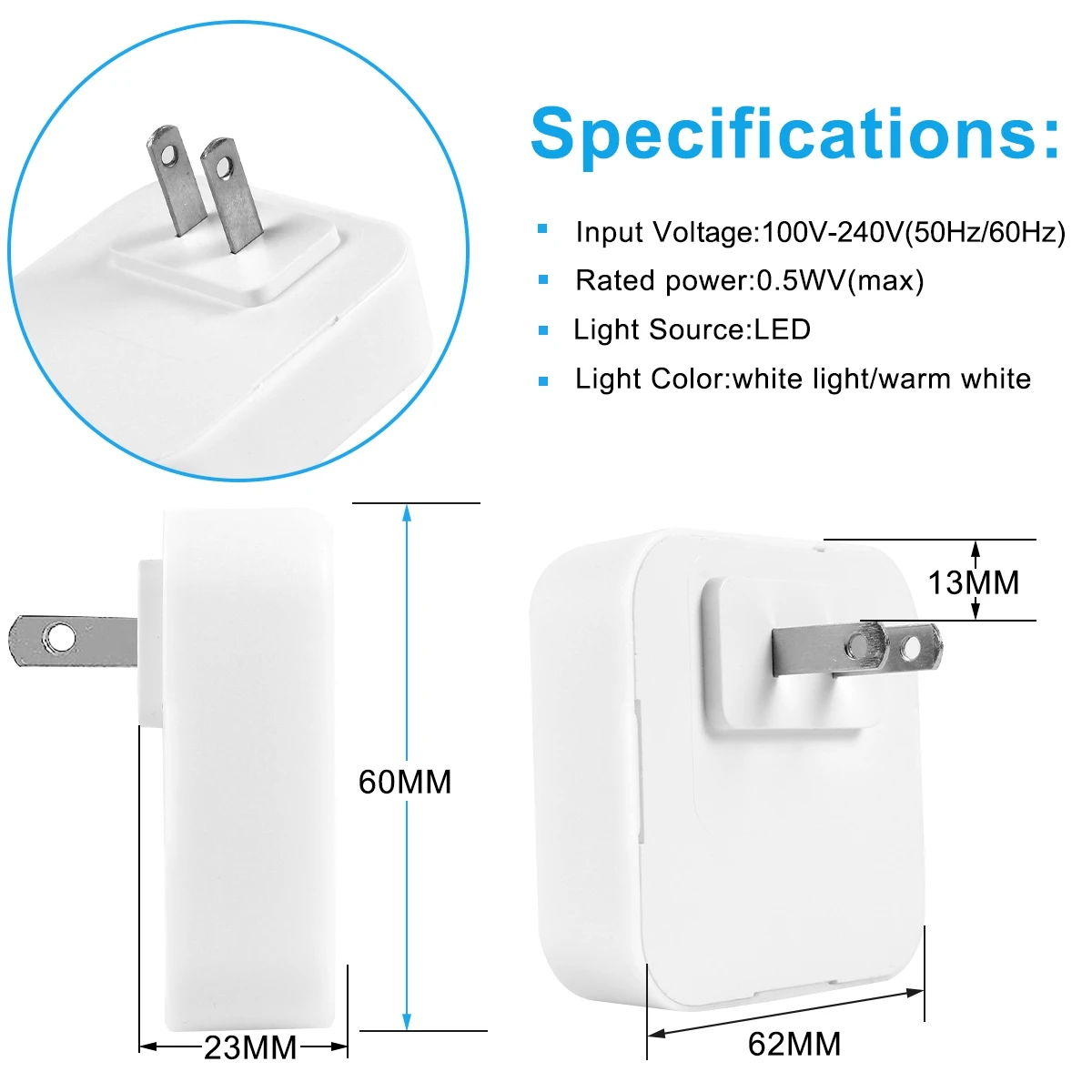 Тип: мини-ночникМатериал: АБС-пластик, поликарбонатЦвет изделия: белый, синий, красный, желтыйМощность: 0,5 WСветовой поток. : 30-40LMЦветность света: белыйСвет: границыДатчик: датчик освещенностиУгол рассеивания света: 360 градусовНапряжение: 110-220 В переменного токаРазмер корпуса: 65*65*28 мм