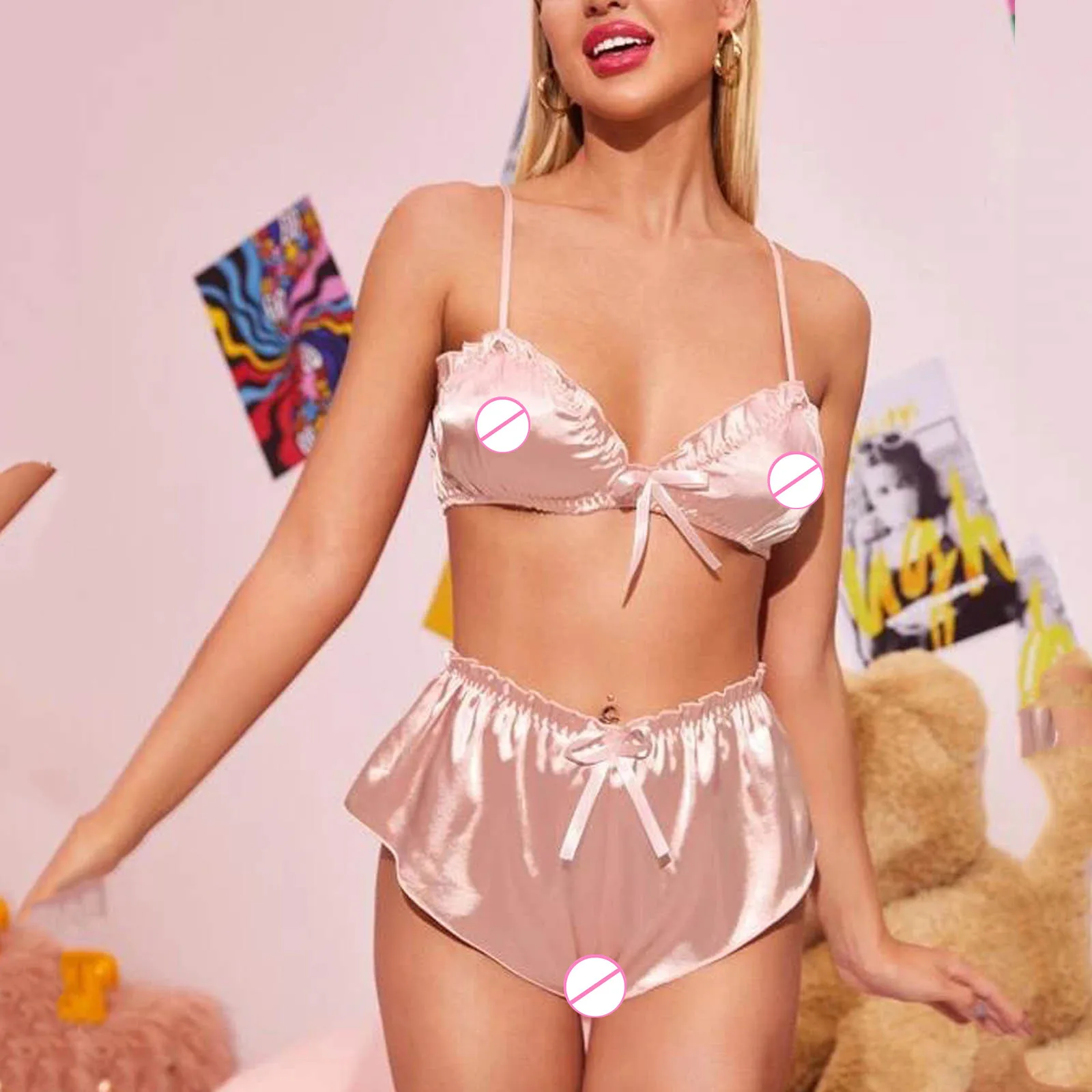 Комплект женского сексуального нижнего белья, бюстгальтер на бретелях-спагетти + шорты, розовое атласное нижнее белье, одежда для сна, женская пижама, сексуальный женский пижамный комплект