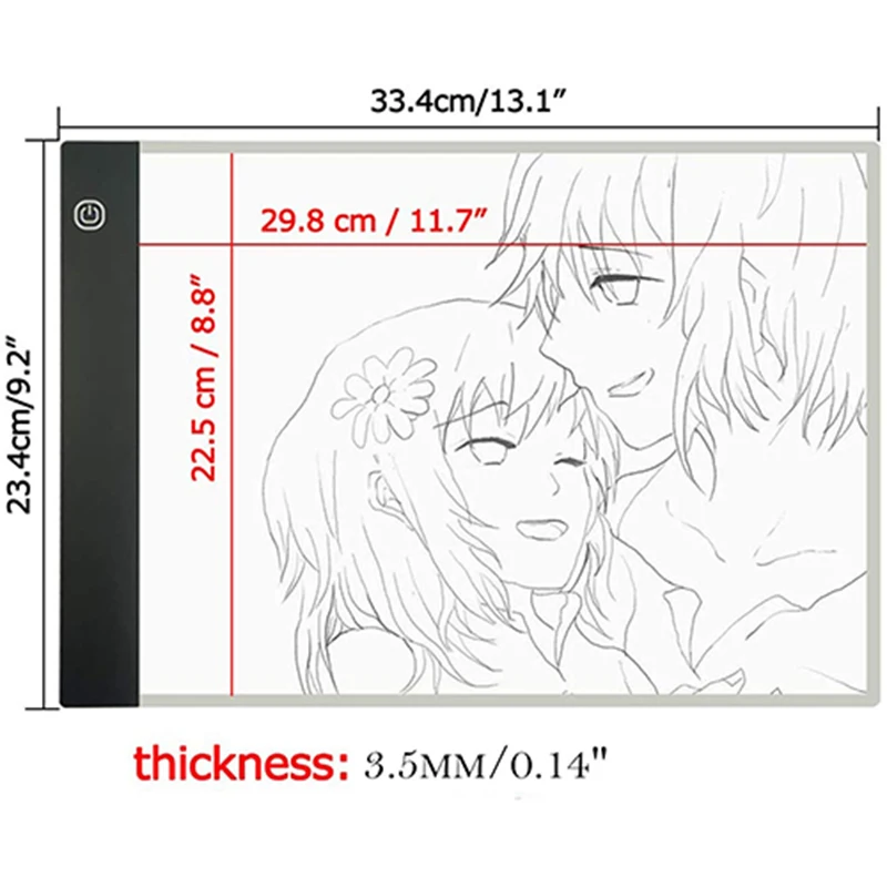 Технические характеристики: A4 планшет доска Pad Материал: акриловые, пластиковые светильник коробка Размеры: 33,5x23,5 см/13,18x9,25 inch Толщина: 0,35 см USB Вход Напряжение: 5V тариф Мощность: 2,8 W Интерфейс: Mirco-usb упаковка включает в себя: 1 кисть для маскирующих средств картина A4 светильник доска USB кабель (1 шт.);