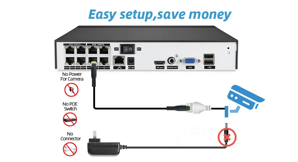 Нет дополнительных кабелей питания или адаптеров, просто подключив ip-камеру к NVR с помощью одного кабеля, вы можете легко завершить установку без знания о компьютере или сети и начать наслаждаться супер простым мониторингом среди вашего смартфона, планшета или ПК.