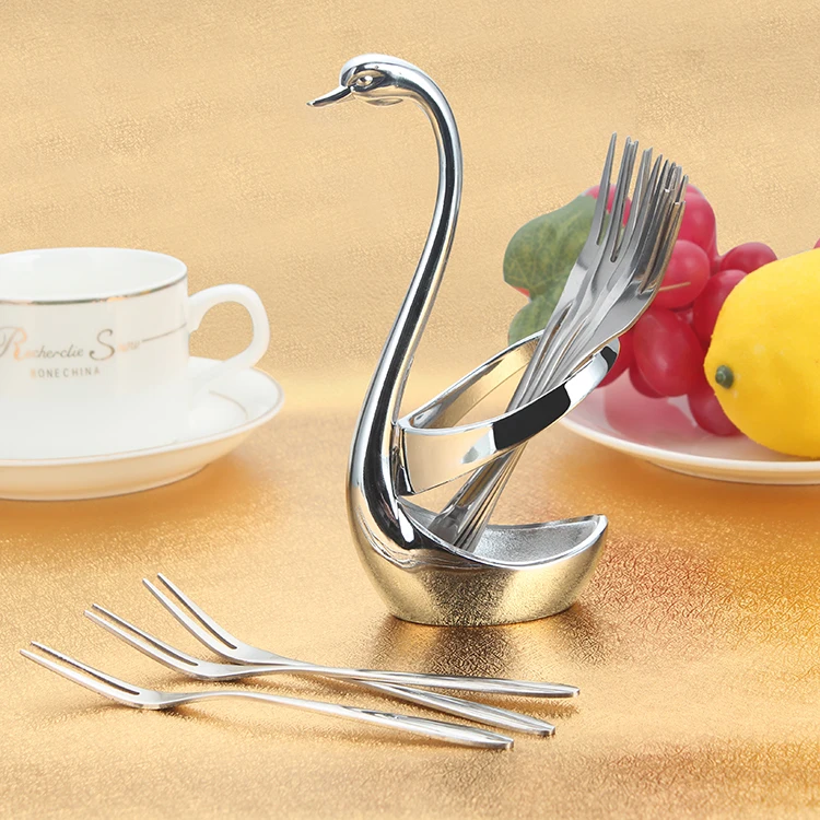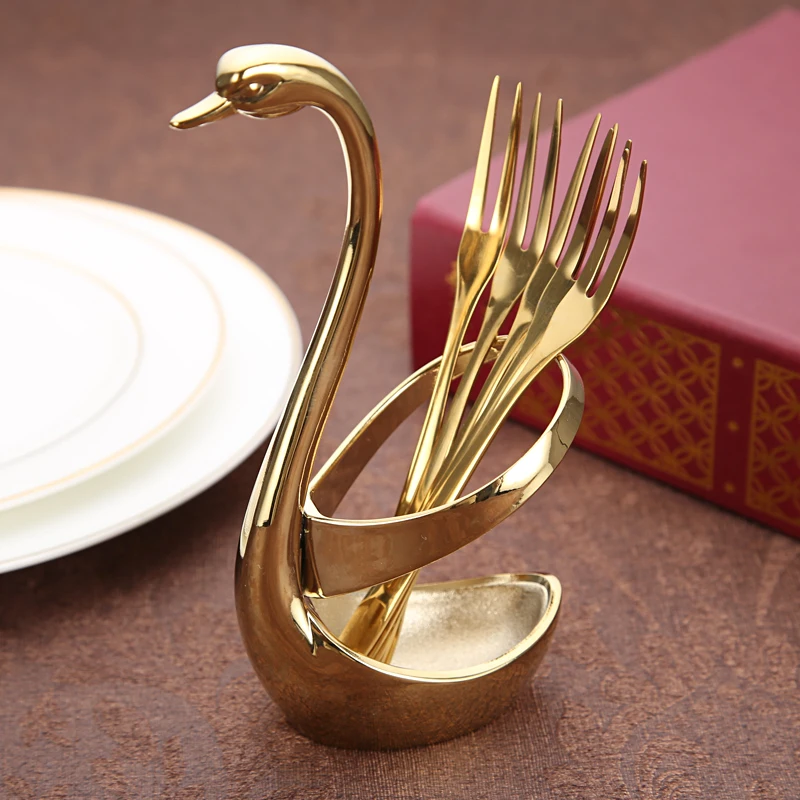 Набор из золотой вилки и лебедя для фруктов, нержавеющая сталь Вилка для торта, десертная, столовые приборы, вилка, нож и вилка, подставка для сервировки стола