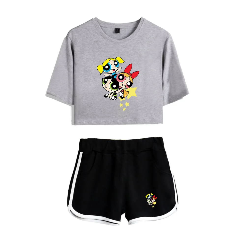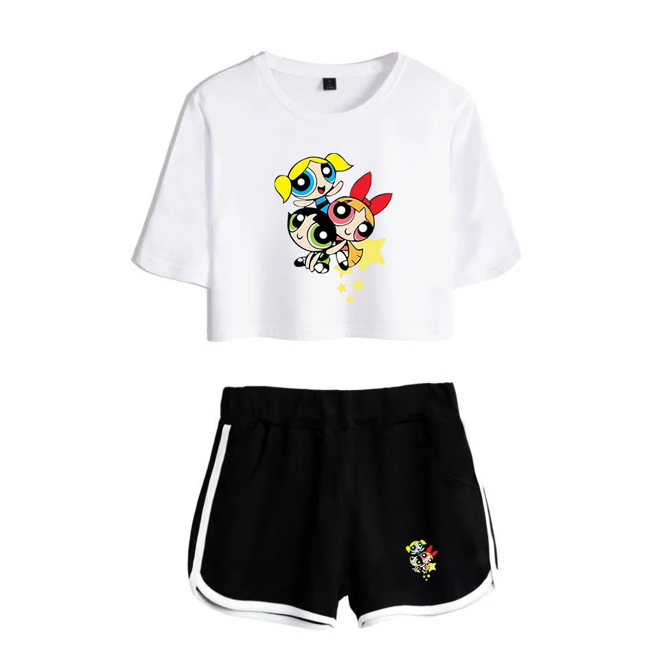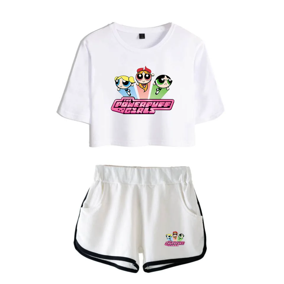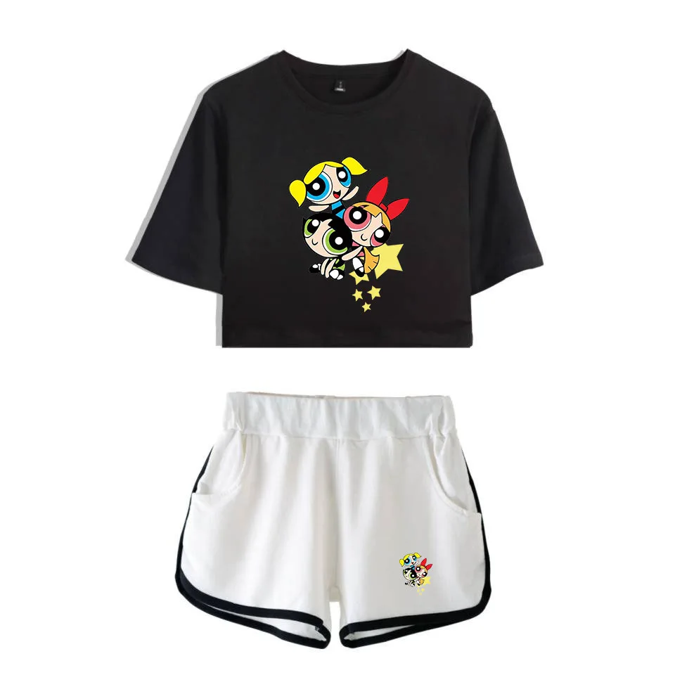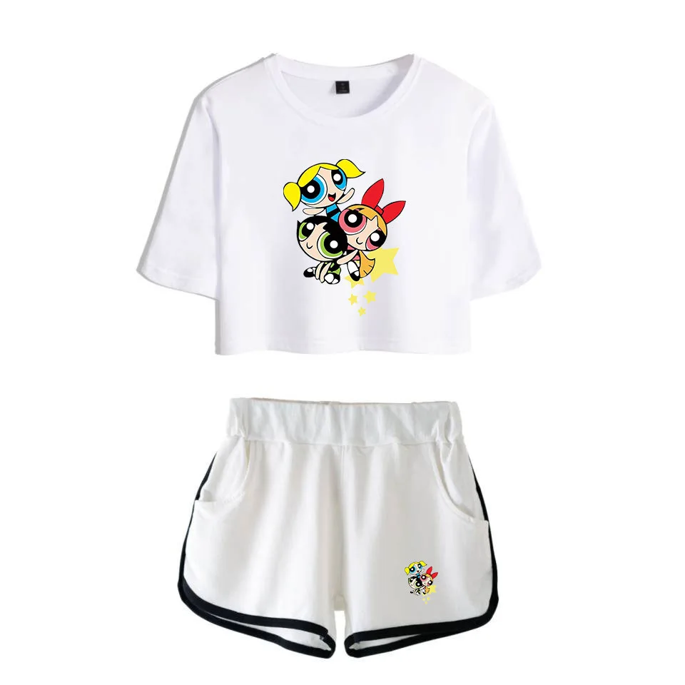 Kawaii Powerpuff Летняя мода для девочек из двух частей, сексуальные шорты + рубашка, повседневные топы с героями мультфильмов, Женский Уличная одежда, спортивный костюм