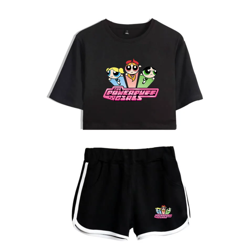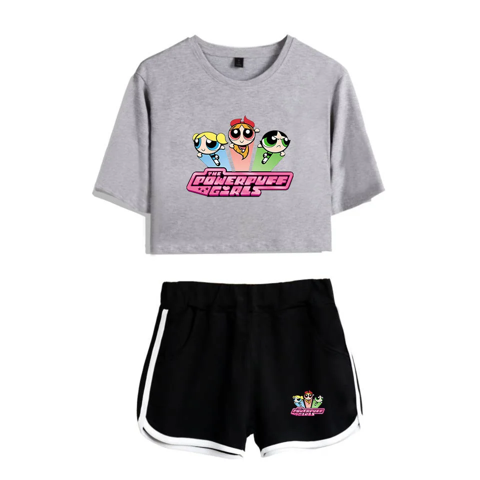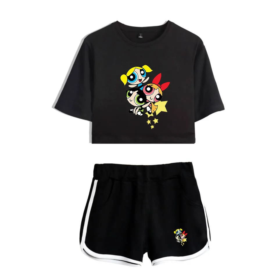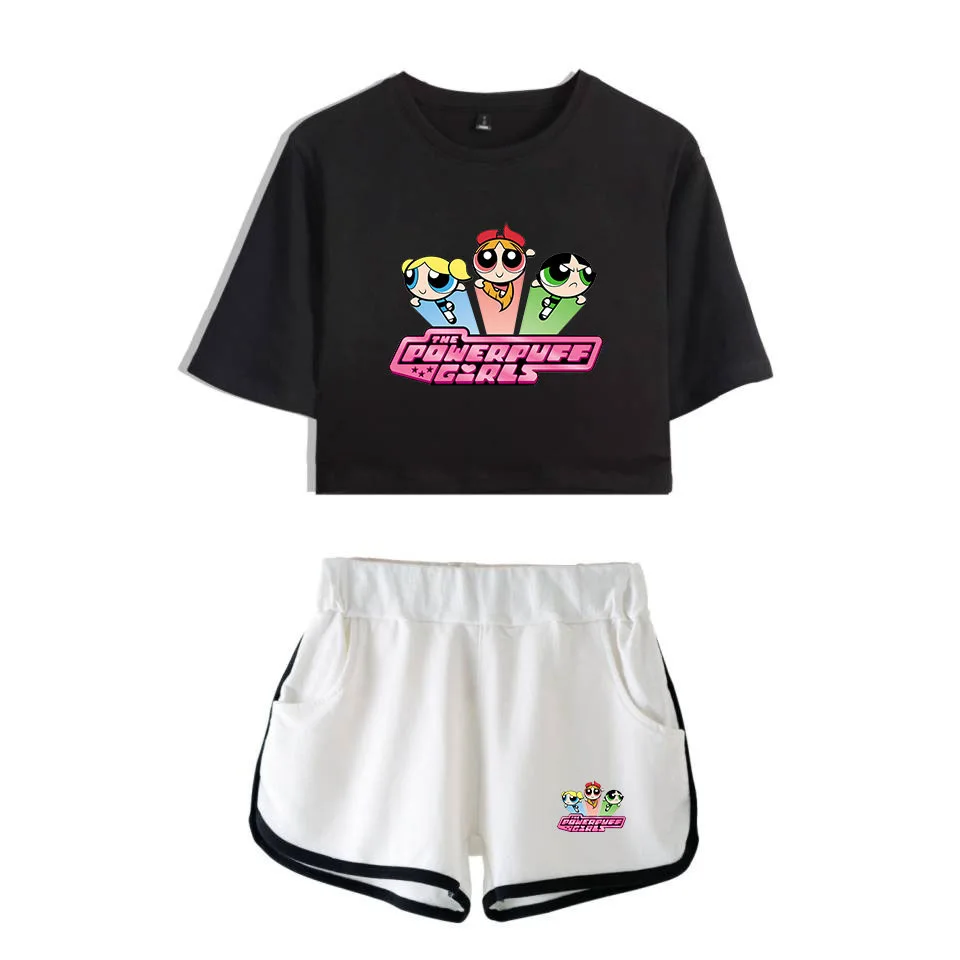 Kawaii Powerpuff Летняя мода для девочек из двух частей, сексуальные шорты + рубашка, повседневные топы с героями мультфильмов, Женский Уличная одежда, спортивный костюм