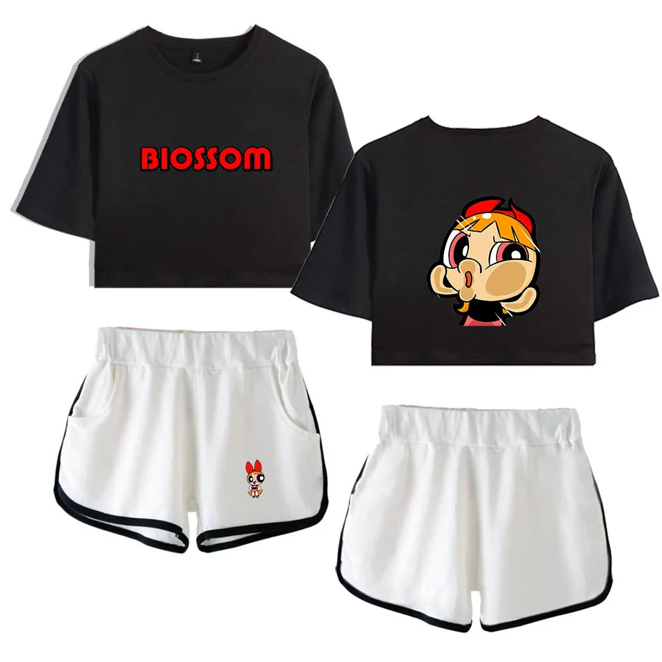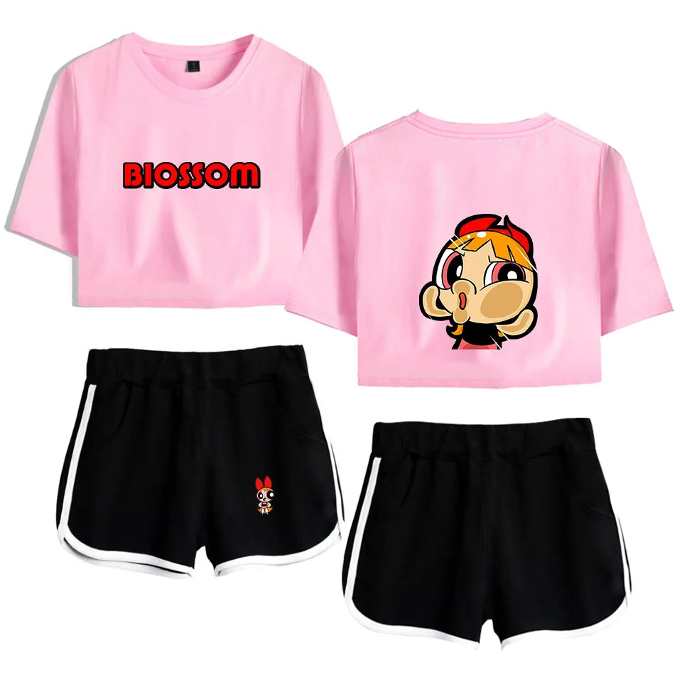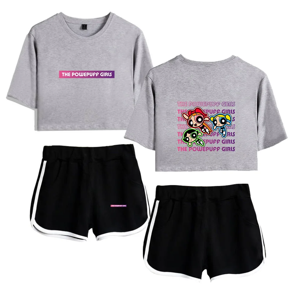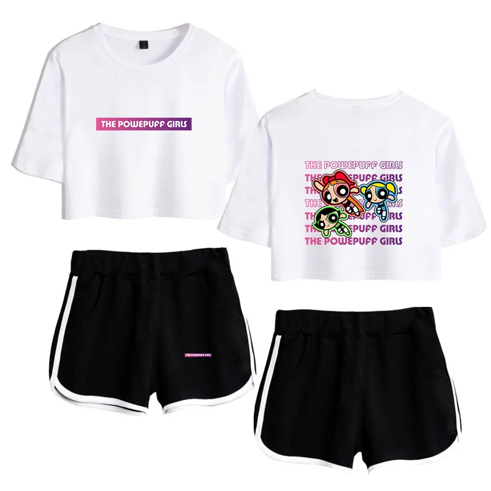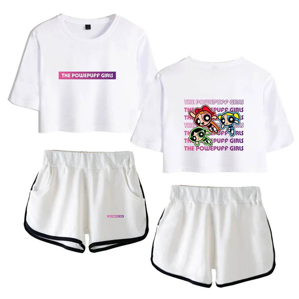 Kawaii Powerpuff Летняя мода для девочек из двух частей, сексуальные шорты + рубашка, повседневные топы с героями мультфильмов, Женский Уличная одежда, спортивный костюм