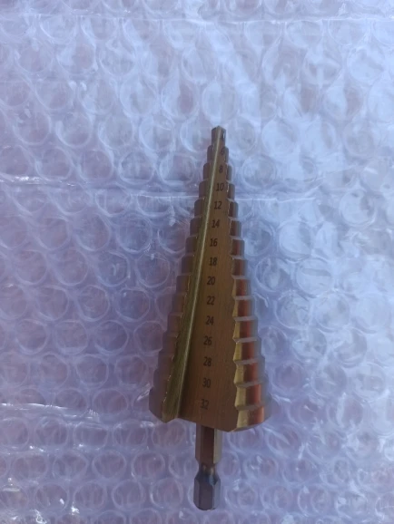 Это новая быстрорежущая сталь с большим шаговым Конусным сверлом, титановый набор сверл, который сделан из высококачественной быстрорежущей стали и с титановым покрытием, чтобы уменьшить трение и тепло Он очень подходит для использования для резки отверстий из различных материалов, включая сталь, латунь, дерево, пластик и т. д. Материал: сталь HSS Отделка: Титан