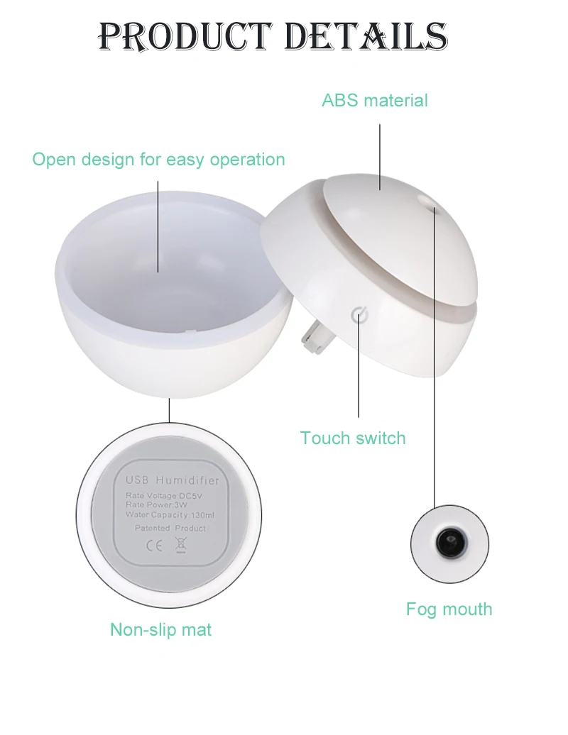 Как использовать?1. Кнопка «светильник» нажмите сначала: Включите светодиодный светильник, цвет меняется автоматически2. Нажмите второй: Выберите один из цветов светодиодный светильник, который вам нравится3. Тумана ButtonPress первый: непрерывный туман выходитНажмите непрерывно, чтобы выбрать времяМатериал: АБС + электронные компоненты.Размеры: 9,7x9,7x9,7 см/3,82x3,82x3,82 дюйма (Д х Ш х В).Цвет: темное дерево.Примечание:1. Обязательно используйте мягкое моющее средство, если вы хотите очистить увлажнитель.2. Не заполняйте воду по максимальной линии в любое время.3. Не включайте питание, когда бак пуст.4. Регулярно чистите в соответствии с инструкцией по обслуживанию, чтобы избежать неисправности.5. При использовании в первый раз, подождите 3-5 минут, потому что ватные тампоны не полностью влажные.6. На 100 мл воды предлагается добавить 2-3 капли эфирного масла.Инструкция по техническому обслуживанию:1. Добавьте небольшое количество теплого кухонного моющего средства.2. Очистите водой.3. Используйте тампон, чтобы аккуратно протереть, а затем используйте чистящую ткань для легкой сушки.
