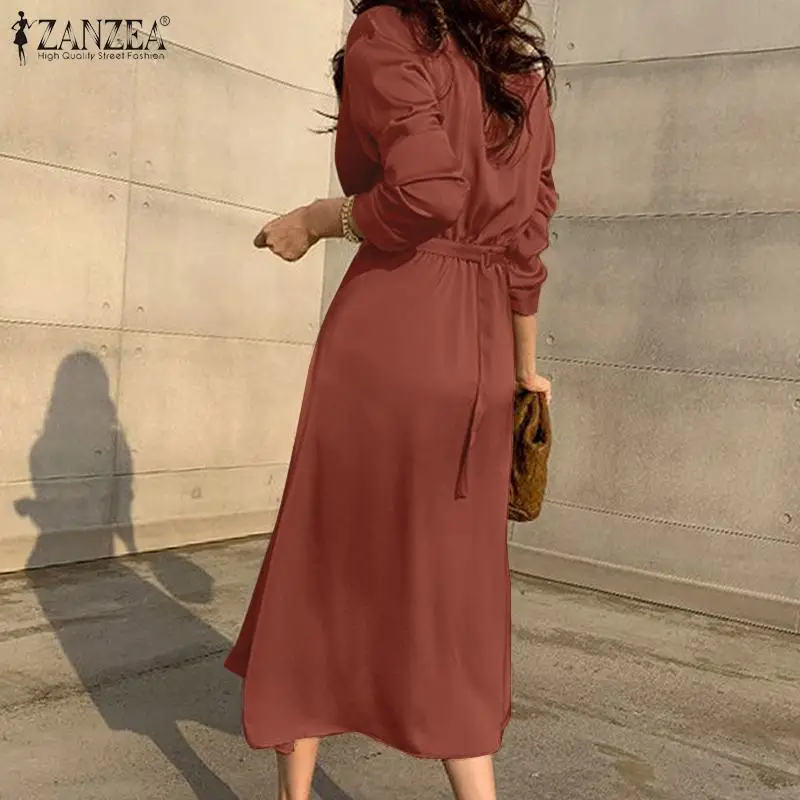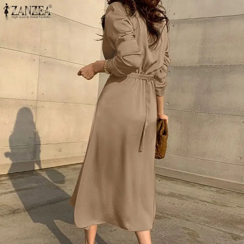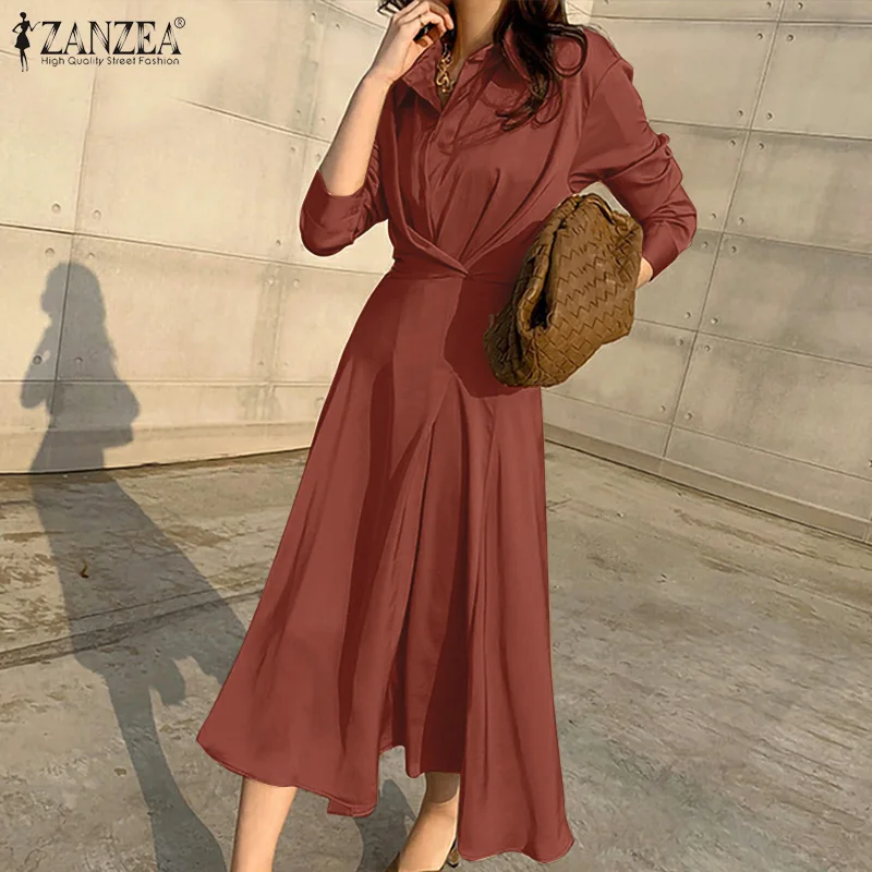Элегантное однотонное платье-рубашка, Женский Асимметричный Сарафан ZANZEA 2021, Повседневное платье миди с длинным рукавом, женское платье на пуговицах с отворотом
