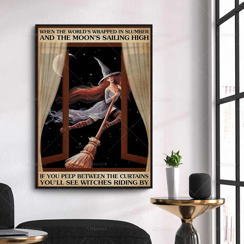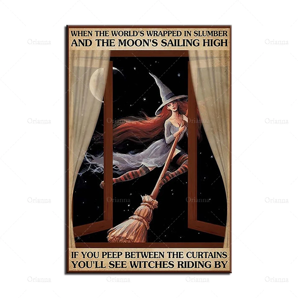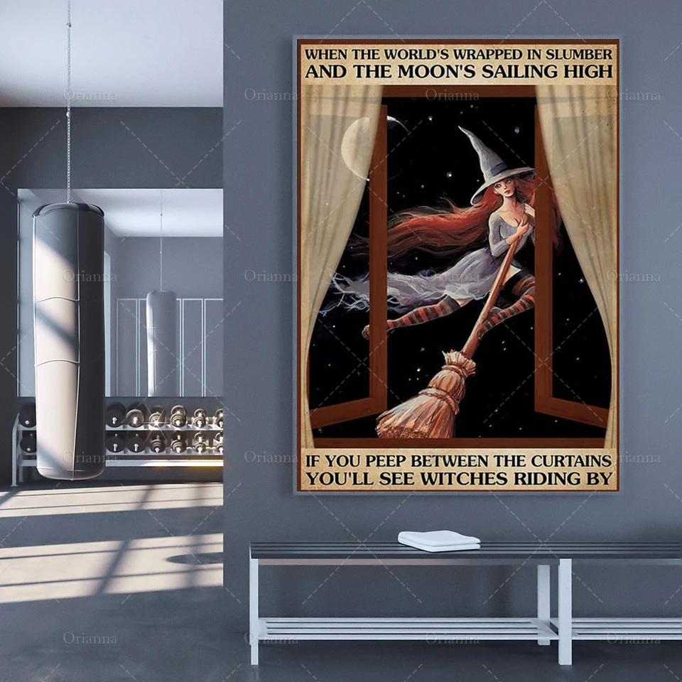 Когда мир завернут в плащ и Луна парусный плакат, Хэллоуин ведьма постер Счастливого Хэллоуина печатная стена искусство