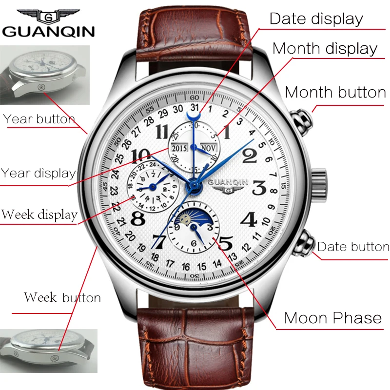 Добро пожаловать в магазин часов GUANQIN. Меня зовут Ван Си Инь, главный менеджер GUANQIN. Для меня большая честь представить вам эти высококачественные часы-Модель no. GUANQIN 20022. Он встроен с высококачественным многофункциональным автоматическим механизмом, улучшенным сапфировым стеклом (улучшенное сапфировое стекло с 2 марта 2020 года) и оснащен дисплеем года, месячным дисплеем, дисплеем недели, дисплеем даты, И фазы Луны, которую вы можете настроить по своему усмотрению. Изображения часов отображаются здесь для справки, если вы хотите узнать больше об этой модели, вы можете проверить клип, надеемся помочь вам сделать правильный выбор. Хорошего дня.