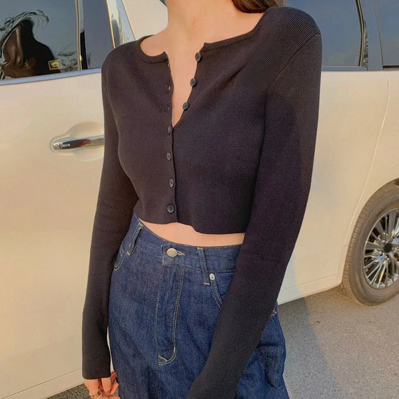 Тонкий женский трикотажный кардиган, сексуальная Однотонная футболка, модная повседневная футболка с длинным рукавом, Студенческая шикарная футболка