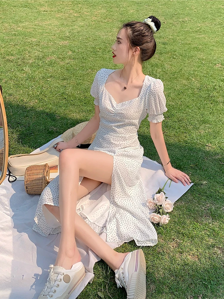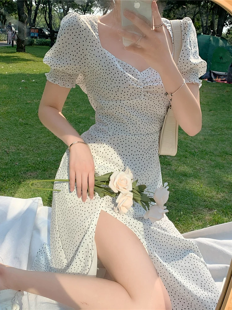2021 Новое французское Ретро шифоновые с Боковым Разрезом платье выше колена в горошек темпераментное модное и Элегантное Длинное Платье качественное платье